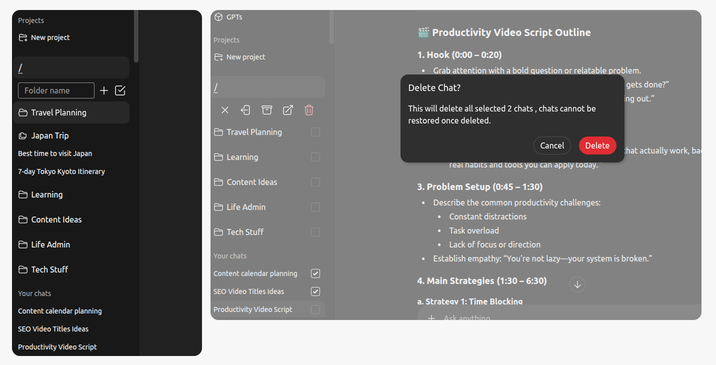Quickly delete, archive, or export multiple chats in one go to streamline your workspace.