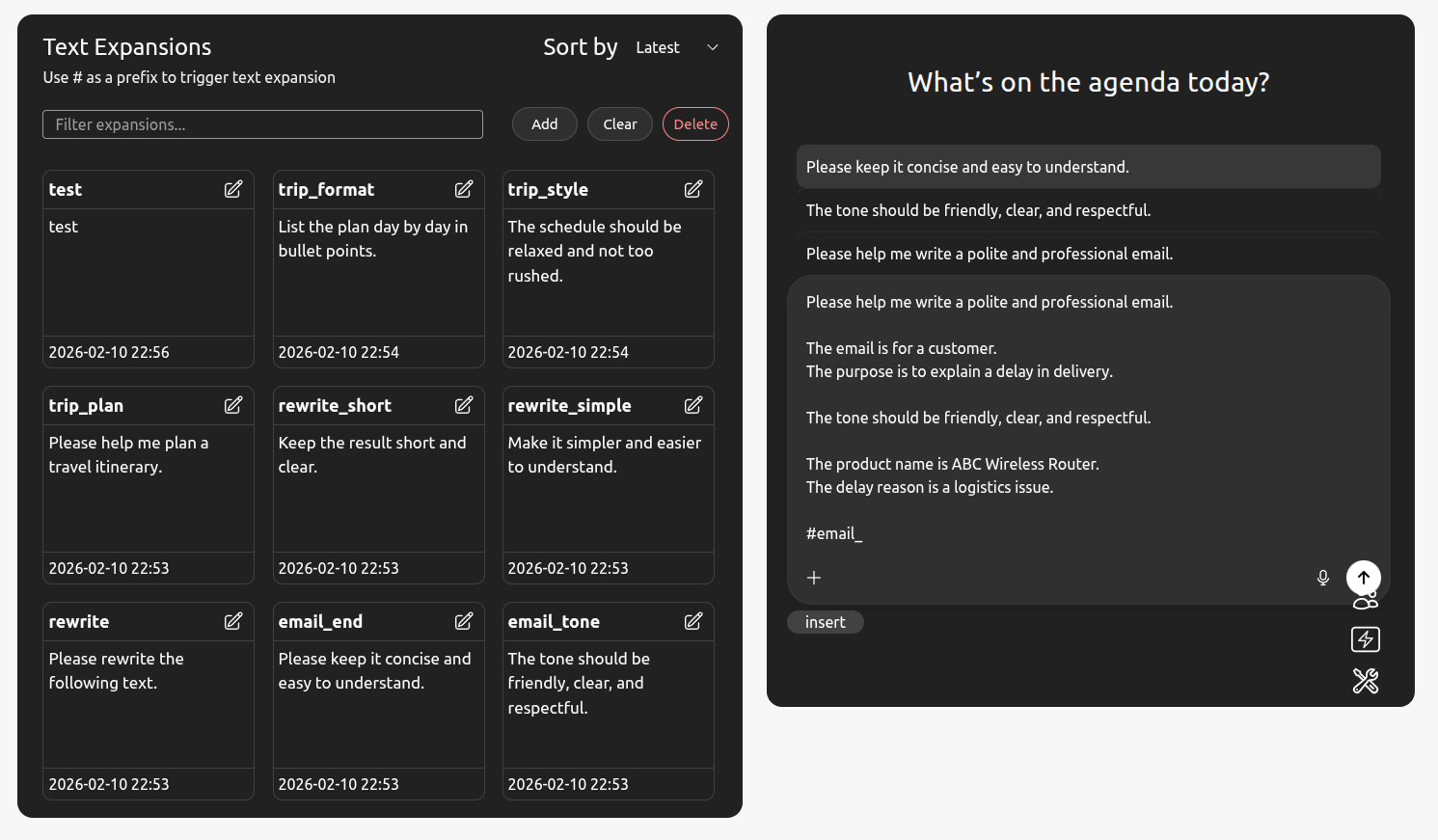 Type #keyword to instantly expand it into full phrases or templates from your custom list.